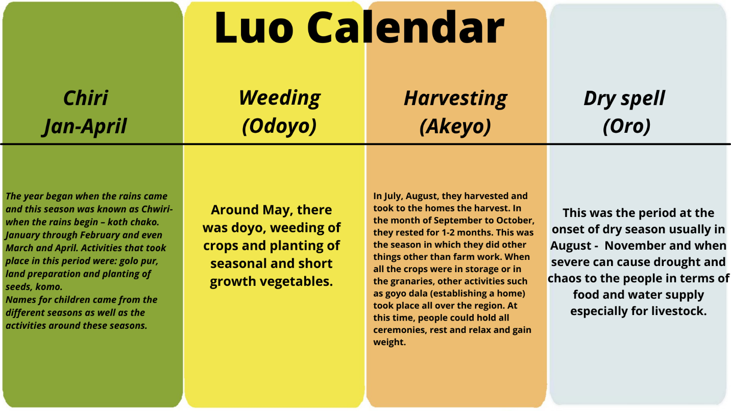 Worldwide, different communities have systems of naming babies according to their observed norms. There are shared naming systems across many communities in Africa. For example names that follow the seasons, time of birth, seasonal activities are the most common. The Luo’s had several naming systems as shown!